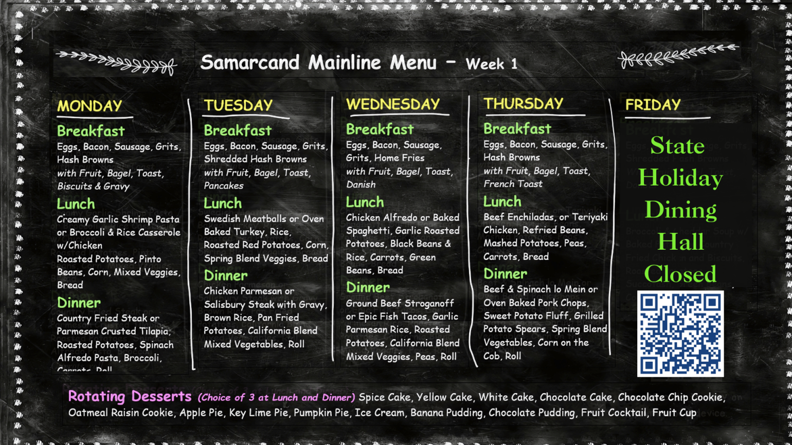 Swedish meatballs or oven-baked turkey. Side options: rice, roasted red potatoes, corn, spring blend veggies, bread. Chicken Carbonara or Oven Baked Pork Chops, Mac & Cheese, Black-eyed Peas, Mixed Veggies, Corn, Roll |